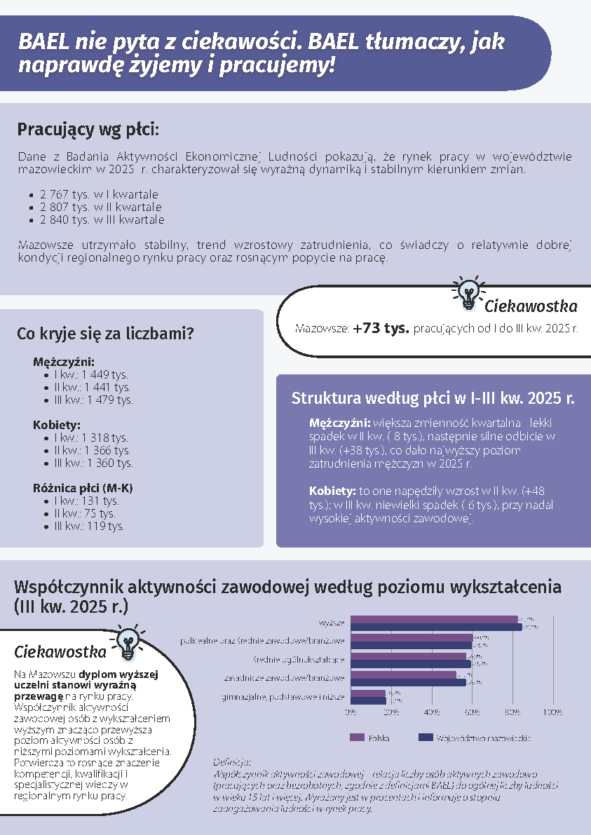Jest to jedno z podstawowych badań prowadzonych przez Główny Urząd Statystyczny w obszarze rynku pracy. Badanie to umożliwia bieżącą ocenę stopnia wykorzystania zasobów pracy, a zarazem pozwala na szerszą charakterystykę poszczególnych grup ludności wyróżnionych ze względu na ich status na rynku pracy (pracujący, bezrobotni) lub pozostających poza rynkiem pracy (bierni zawodowo). Ponadto w 2023 r. w ramach Badania Aktywności Ekonomicznej Ludności będą zbierane dodatkowe informacje z zakresu tematu dotyczącego przejścia z pracy na emeryturę oraz pracy nierejestrowanej. Po raz pierwszy Badanie Aktywności Ekonomicznej Ludności przeprowadzono w Polsce w maju 1992 r. BAEL jest polską edycją europejskiego badania siły roboczej (ang. Labour Force Survey/LFS).