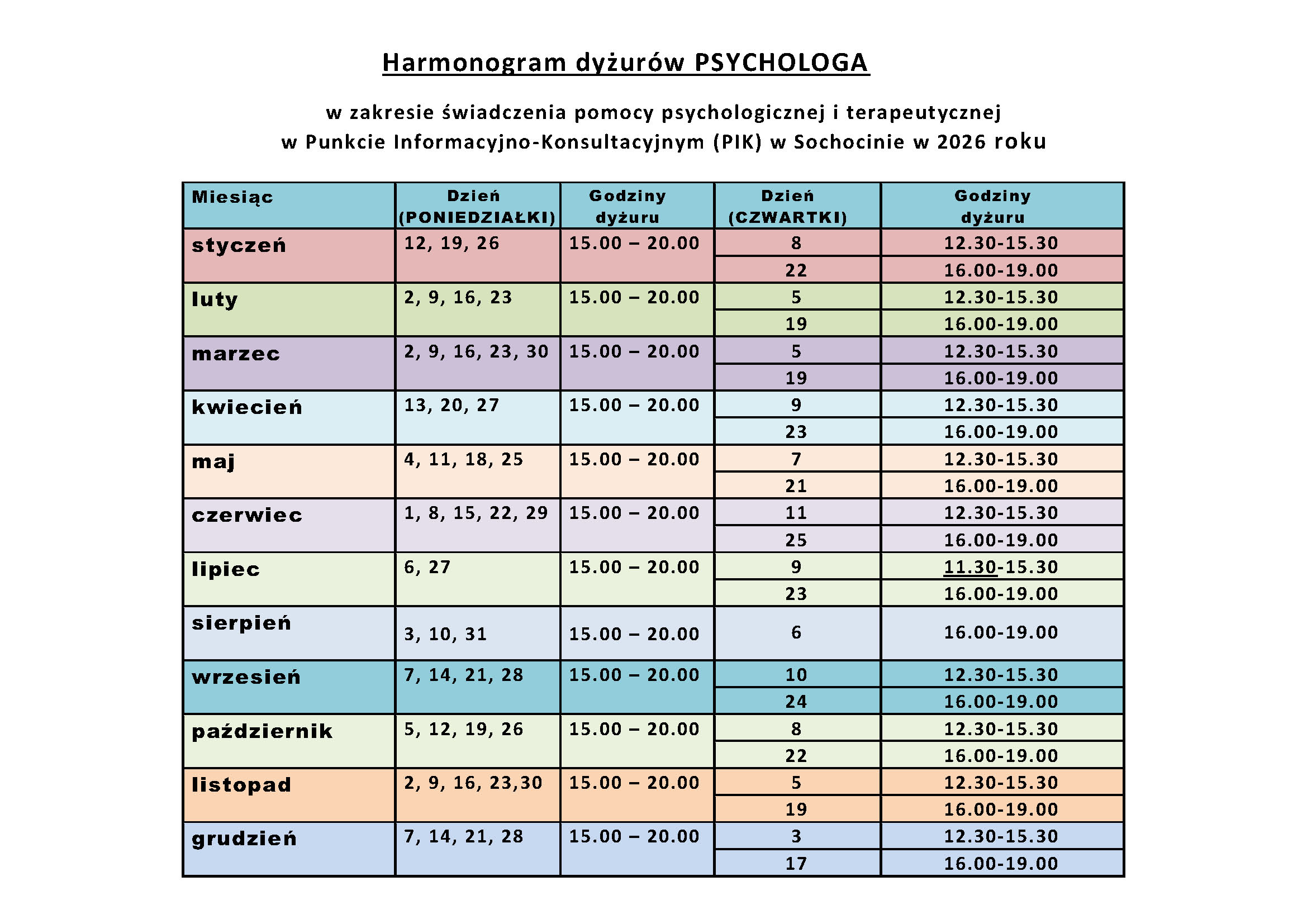 Przedstawiamy Państwu harmonogram dyżurów psychologa, w zakresie świadczenia pomocy psychologicznej i terapeutycznej w Punkcie Informacyjno-Konsultacyjnym (PIK) w 2026 roku.