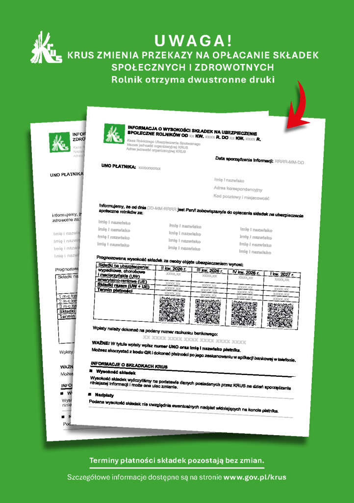 Szczegółowe informacje dotyczące nowych zasad oraz aktualnych przepisów dostępne są na stronie internetowej KRUS: https://www.gov.pl/web/krus (przejście do zewnętrznego serwisu i otwarcie nowej zakładki).