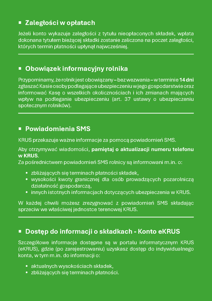 Rezygnacja z papierowych przekazów oznacza przejście na nowocześniejsze formy komunikacji. Ubezpieczeni będą mogli nadal korzystać z portalu eKRUS oraz oficjalnej strony internetowej instytucji – a także z przypomnień SMS – po wcześniejszym wyrażeniu zgody. Szczególnie zachęcam do zakładania kont w systemie eKRUS, który umożliwia szybki dostęp do aktualnych informacji o składkach. Z rozwiązania tego mogą korzystać wszyscy ubezpieczeni: rolnicy, domownicy oraz pomocnicy rolnika.