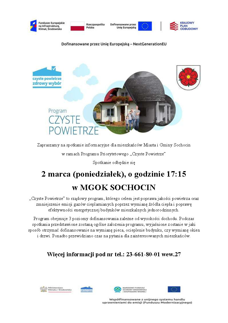 zapraszamy Państwa na spotkanie informacyjne, które odbędzie się w dniu 2 marca 2026 r. (poniedziałek), o godzinie 17.15, w sali widowiskowej Miejsko-Gminnego Ośrodka Kultury w Sochocinie, przy ulicy Guzikarzy 8A, organizowane w ramach działania punktu konsultacyjno-informacyjnego programu „Czyste powietrze”.